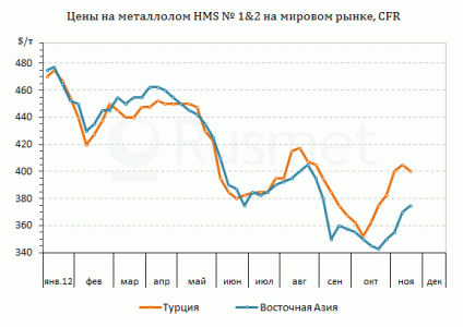 Экспортные котировки на американский лом HMS № 1&2 (80:20) подскочили в начале ноября для турецких покупателей до около $410 за т CFR, однако долгое время они имели, в основном, виртуальный характер, служа ориентиром для других поставщиков. Турецкие металлурги, испытывавшие трудности с повышением котировок на длинномерный прокат, предпочитали приобретать менее дорогостоящий материал в России и европейских странах.