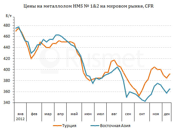 В начале второй декады стоимость американского металлолома HMS № 1&2 (80:20) при поставках в Турцию сократилась до $380-390 за т CFR при низком спросе. Российские поставщики предлагавшие свой материал 3А по $370-375 за т CFR, оказались вообще вне рынка. На Дальнем Востоке котировки на американский лом HMS № 1&2 (80:20), доставляемый в контейнерах, опустились в Корее и на Тайване до отметки $355-360 за т CFR.