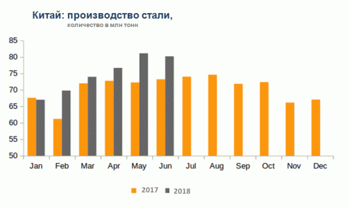 По месячным объемам производство стали в стране незначительно снизилось на 1% до 80,2 млн тонн в июне 2018 года против 81,12 млн тонн в мае 2018 года.