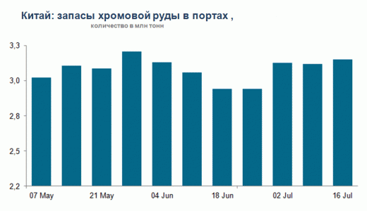 Согласно мнению экспертов, на 16 июля запасы хромовых руд в портах Китая выросли до 3,19 млн т (т.е. + 1,3% за неделю, + 5% за месяц, + 23% в годовом исчислении).