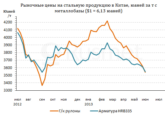 /Rusmet.ru, Виктор Тарнавский/ Снижение внутренних котировок на стальную продукцию в Китае продолжается уже три с половиной месяца. За это время цены на основные категории проката упали на $70-110 за т. Стоимость продукции в среднем по рынку в конце мая лишь незначительно превышала предыдущий минимум, наблюдавшийся в начале сентября прошлого года. А в некоторых крупных городах восточного побережья рыночные цены упали до уровня конца 2009-го – начала 2010 года. На Шанхайской фьючерсной бирже котировки на арматуру по наиболее торгуемому контракту впервые в истории торгов упали до менее 3450 юаней ($563) за т. Это означает, что участники рынка ожидают продолжения спада.