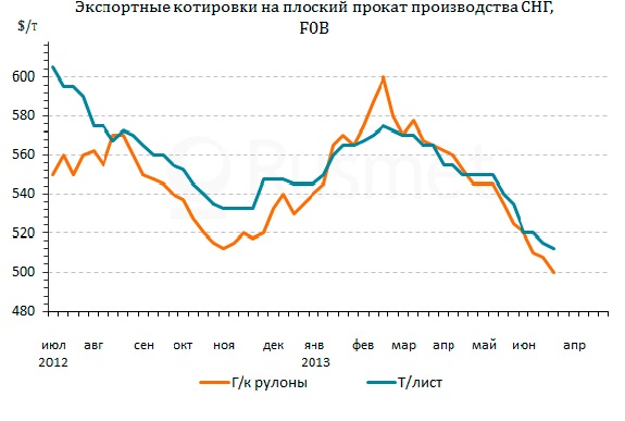 Проблема экспортеров заключается в том, что и на других рынках ситуация не лучше. В Европе в первой половине июня плоский прокат резко подешевел. Поэтому российским и украинским поставщикам тоже пришлось опустить котировки на горячекатаные рулоны до около $520-540 за т DAP. В странах Персидского залива многие покупатели в середине июня уже ушли с рынка, а цены на китайскую, индийскую и корейскую продукцию упали к настоящему времени до $540-560 за т CFR. Поэтому горячий прокат из СНГ местные дистрибуторы готовы приобретать не более чем по $480-500 за т FOB.