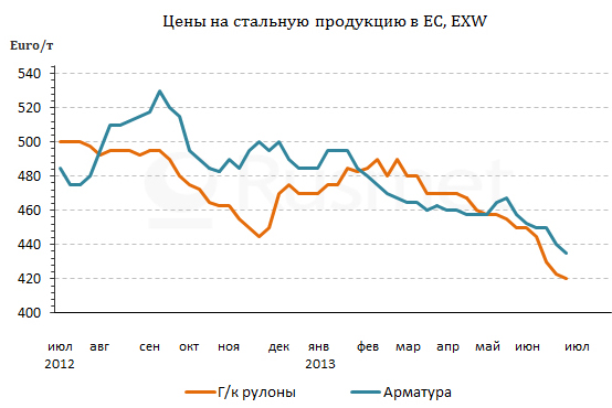 /Rusmet.ru, Виктор Тарнавский/ Падение курса евро по отношению к доллару после того как руководство Федеральной резервной системы США объявило о возможном сворачивании программы по выкупу гособлигаций у национальных банков к концу текущего года, как ни странно, помогло европейским металлургам приостановить снижение котировок на стальную продукцию на региональном рынке. Хотя цены продолжали скользить вниз до самого конца июня, как сами металлурги, так и большинство аналитиков предполагают, что спад все-таки подошел к концу.
