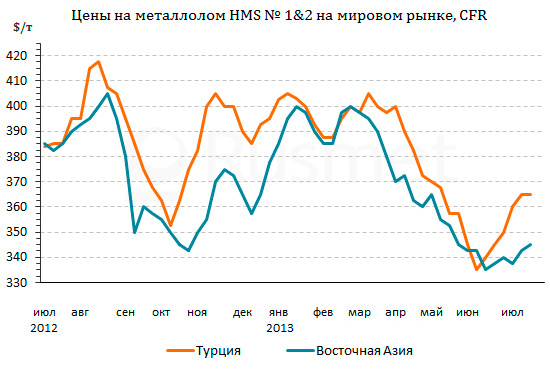 Перестали расти и цены на длинномерный прокат. Американским компаниям вообще не удалось добиться их роста в июле несмотря на весьма существенное подорожание лома, а турецким производителям пришлось признать завершение постепенного подъема, продолжавшегося еще с конца мая. Крупнейшие покупатели турецкой арматуры явно не готовы платить дороже $590-600 за т CFR, тем более, что с наступлением Рамадана спрос в ближневосточных странах несколько уменьшился. Так что, отметка $365 за т CFR, скорее всего, станет для металлолома предельной – по крайней мере, на ближайшие несколько недель.