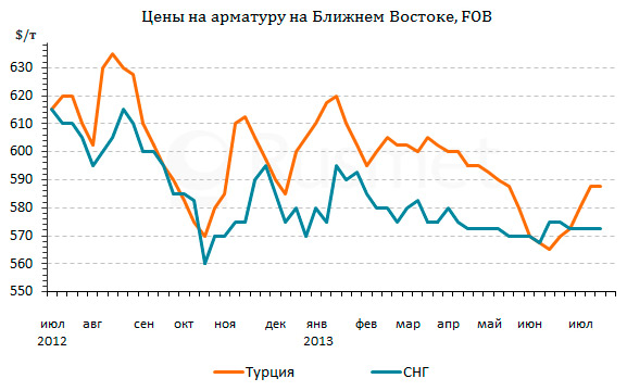 Для турецких компаний минимальный уровень находится в настоящее время на отметке $580 за т FOB. На таких условиях осуществлялись в середине июля поставки на конкурентный рынок ОАЭ. Прочие потребители в США, странах Африки и Ближнего Востока платили за турецкую арматуру примерно $585-595 за т FOB.