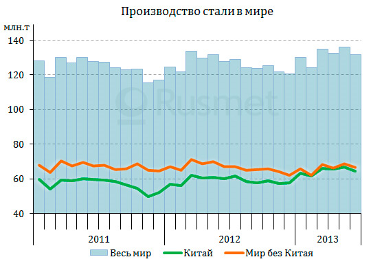 Всего за первое полугодие 2013 года объем мирового производства стали достиг 789,8 млн. т. Превышение показателя годичной давности составило 2,2%. Темпы роста лишь незначительно снизились по сравнению с 2,3% по итогам января-мая. В целом обстановка на мировом рынке выглядит весьма противоречивой. С одной стороны, в последние несколько недель спрос и цены пошли на повышение, а в начале осени ожидается окончательное восстановление. С другой, многие эксперты называют избыток предложения одной из основных проблем отрасли. По данным ОЭСР, излишек мощностей оценивается в настоящее время 334 млн. т в год, из которых около 200 млн. т приходится на Китай. Эти мощности находятся, если можно так выразиться, в ближнем резерве и могут быстро вернуться на рынок при улучшении ситуации. Поэтому, рост, прогнозируемый в августе-сентябре, может вскоре снова смениться спадом.