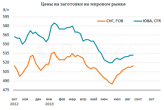 На дальневосточном рынке заготовок всю первую половину августа также царило затишье. Однако основной его причиной было не отсутствие спроса, а существенные расхождения в ценах спроса и предложения. Металлургические компании поднимали котировки, ориентируясь на подорожание металлолома, прибавившего с конца июля не менее $10-15 за т. В частности, тайванские и корейские производители, использующие значительные объемы импортного сырья, предлагали заготовки в страны Юго-Восточной Азии не менее чем по $540 за т CFR, тогда как встречные предложения были, по меньшей мере, на $5-10 за т ниже. Запросы потребителей, при этом, определялись низкими региональными ценами на арматуру и катанку и ограниченным, в силу сезонных факторов, объемом потребления этой продукции.