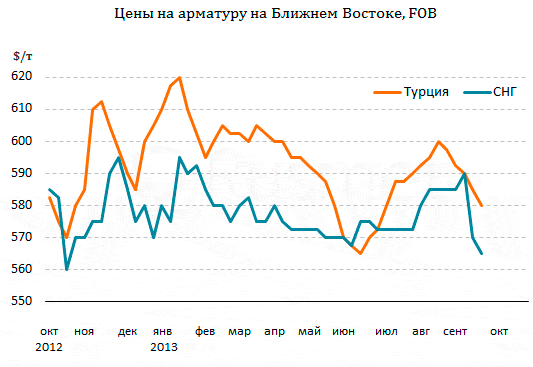 Внутреннюю котировки на арматуру в Турцию в последние три недели относительно стабильны в долларовом эквиваленте на уровне около $580-595 за т EXW, хотя местные компании постоянно меняют котировки в лирах, приспосабливаясь к скачкам курса. Однако на внешних рынках цены неуклонно идут вниз. С начала сентября турецкая арматура подешевела более чем на $10 за т. В середине месяца сделки заключались из расчета, в среднем, $580 за т FOB.
