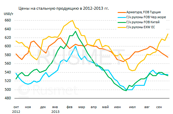 На Ближнем Востоке рыночную ситуацию заметно ухудшил другой краткосрочный фактор – кризис в Сирии, едва не приведший к полномасштабной войне, в которую могли бы быть втянуты и другие страны региона. Если учесть также и высокий уровень политической напряженности и в других странах региона – Ливии, Египте, Йемене, а также изменения в законодательстве Саудовской Аравии, в значительной мере сократившие использование труда гастарбайтеров, не удивительно, что в экономике региона наблюдался спад, а спрос на стальную продукцию был ограниченным. Соответственно, в течение сентября понизились котировки как на длинномерный, так и на плоский прокат.