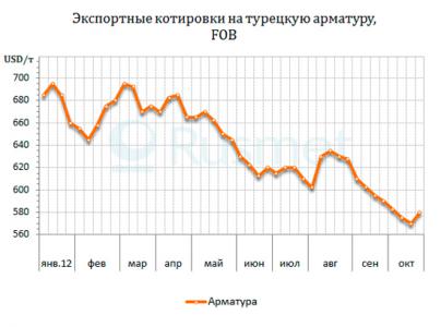 Наибольших успехов турецкие компании добились на внутреннем рынке. Стоимость арматуры, ранее опустившаяся до около $570-580 за т EXW, за последнюю неделю подскочила примерно на $20 за т. Экспортные котировки, в крайней точке спада сократившиеся до $565-575 за т FOB, вышли на уровень $575-585 за т FOB, а некоторые компании выставляли предложения на уровне $590 за т FOB. Улучшили свое положение и поставщики из стран СНГ. Стоимость украинской арматуры в последние дни поднялась до $570-580 за т FOB, хотя в первой половине октября поставки могли осуществляться и по $560 за т FOB.