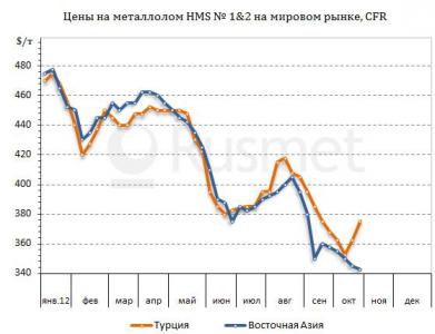 /Rusmet.ru, Виктор Тарнавский/ Во второй половине октября цены на металлолом в Турции пошли вверх, вернувшись на уровень более чем месячной давности. Накануне праздника Курбан-Байрам, который отмечают в мусульманских странах 24-28 октября, стоимость европейского ломаHMS № 1&2 (80:20) поднялась до $370-375 за т CFR, прибавив порядка $10-15 за т за предыдущие две недели, а американские трейдеры взвинтили цены на аналогичный материал до $375-380 за тCFR. Лом 3А из России и Румынии подорожал до $360-370 за т CFR.