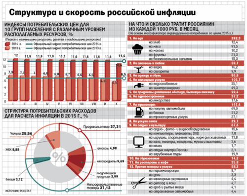 Доли пересчитываются ежегодно на основе данных от самих домохозяйств о структуре их расходов. С 2013 г. за основу берутся данные не одного, а двух предыдущих лет по IV квартал, т. е. инфляция-2015 будет измеряться по структуре потребления, сложившейся с IV квартала 2012 г. по IV квартал 2014 г., следует из методики Росстата.