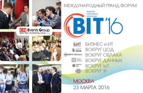 23 марта 2016 года Москва снова встречает Международный Гранд Форум «Бизнес и ИТ. Вокруг ЦОД. Вокруг Облака. Вокруг Данных. Вокруг IP. Вокруг IoT» (или BIT-2016). В рамках BIT-2016 вы сможете узнать и обсудить с коллегами и представителями ведущих вендоров актуальные вопросы и тенденции, связанные с ИТ в бизнесе, созданием и эксплуатацией ЦОД, использованием облачных и IP-технологий, инфраструктурой и использованием данных, а также открыть для себя «Интернет вещей».