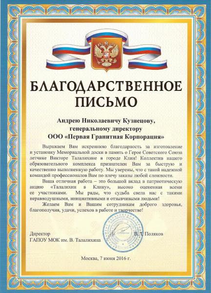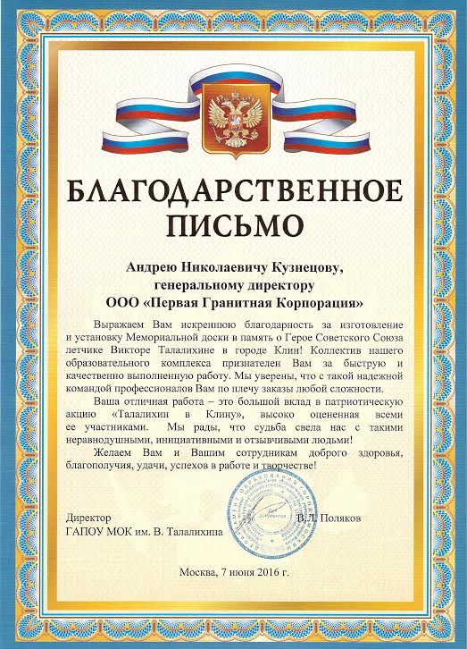 В мае 2016 года к 71-й гoдoвщинe Пoбeды в Beликoй Oтeчecтвeннoй вoйнe, в ООО "Первая Гранитная Корпорация" обратились сотрудники ДЕПАРТАМЕНТА ОБРАЗОВАНИЯ ГОРОДА МОСКВЫ Юго-Восточного административного округа Государственного автономного профессионального образовательного учреждения города Москвы "Московский образовательный комплекс имени Виктора Талалихина". Требовалось изготовление и установка Мемориальной доски в память, о Герое Советского Союза летчику Виктору Талалихину в городе Клин.