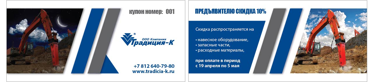 Филиал Компании «Традиция-К» в санкт- Петербрге приготовил для посетителей стенда E 121 сюрприз! 23-я Международная выставка строительных и отделочных материалов InterStroyExpo пройдёт с 19-21 апреля 2017 г. Каждый посетитель выставки Интерстройэкспо получит номерной купон на скидку 10% при покупке навесного оборудования, запчастей и расходных материалов к ним. Купон действует при оплате в период 19 апреля по 5 мая 2017 г. Не упустите шанс сделать выгодную покупку! Из новинок, которые мы представим на стенде вы увидите наклонно-поворотный вибропогружатель Impulse VP600R. Образцы из уникальной партии гидромолотов Impulse ко Дню Победы будут представлены на открытой площадке выставочного стенда. Гидромолоты Impulse будут представлены в защитном цвете «хаки» с праздничной символикой.