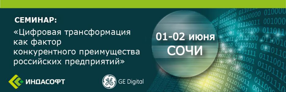 ООО «ИндаСофт» совместно с компанией GE Digital приглашают Вас посетить специализированный двухдневный семинар «Цифровая трансформация как фактор конкурентного преимущества российских предприятий», который пройдет 1 и 2 июня в г. Сочи по адресу: ул. Черноморская, 4, гостиница «Sea Galaxy Congress & Spa Hotel».