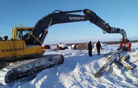 Село Нижняя Пёша расположено в Заполярном районе Ненецкого автономного округа. Здесь, в суровых условиях Русского Севера, сервисные инженеры Санкт-Петербургского филиала Компании «Традиция-К» произвели шеф-монтаж наклонно-поворотного вибропогружателя Impulse VP350R и гидровращателя Delta RD-35 на экскаватор Volvo EC-240.