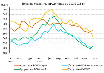 На протяжении большей части июня цены на стальную продукцию продолжали снижаться в силу действия тех же неблагоприятных факторов, что и в предыдущие месяцы. В Европе ситуация в реальном секторе экономики не улучшалась, а кредитный дефицит принимал все более острый характер. В Китае сокращение объема предложения стальной продукции во второй половине мая оказалось, по большому счету, символическим, так что перепроизводство сохранялось практически на том же уровне, что и раньше. Наконец, в странах Ближнего Востока усиливался разрыв между относительно благополучным регионом Персидского залива и прочими государствами, все сильнее страдающими от политических и экономических неурядиц. Спрос на стальную продукцию оставался по-прежнему ограниченным, из-за этого турецким, украинским и российским металлургам приходилось сокращать объемы выпуска и экспорта.