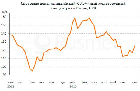 /Rusmet.ru, Виктор Тарнавский/ Первая неделя июля оказалась весьма удачной для поставщиков железной руды. Спотовые цены на международном рынке поднялись за этот период примерно на $8 за т, что представляет собой самое значительное недельное повышение за шесть месяцев, и достигли $125 за т CFR Китай для 63,5%-ного индийского концентрата – самого высокого показателя за последние шесть недель. Однако этот рост оказался недолгим. В последние дни руда снова пошла на понижение, потеряв несколько долларов. Впрочем, экспортеры надеются, что в ближайшее время она все-таки не опустится ниже отметки $120 за т CFR.