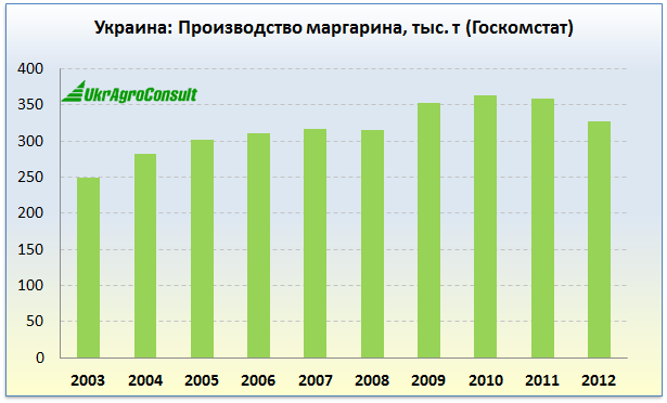 Производство маргарина в 2012 году снизилось и, согласно оценкам Госкомстата, составило 328 тыс. т, что на 9% меньше, чем в 2011. То есть, производство маргарина снижается уже третий год после рекордных объемов (363 тыс. т) в 2010 году.