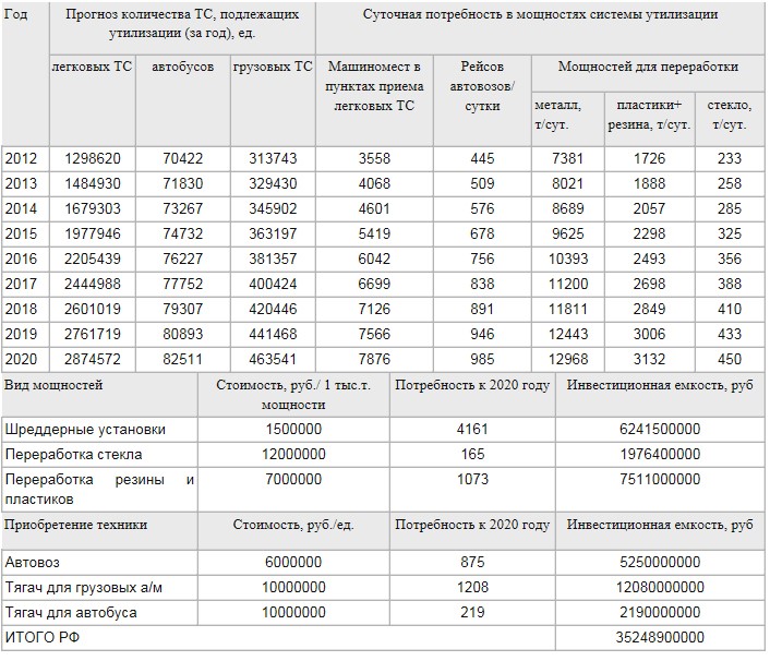 В соответствии с Постановлением Правительства РФ от 30.08.2012 г. № 870 «Об утилизационном сборе в отношении колесных транспортных средств», а также в свете ожидаемых поправок к Федеральному закону «Об отходах производства и потребления», за счет уплаты утилизационного сбора производителями и импортерами должны быть сформированы целевые фонды для развития комплексной системы утилизации транспортных средств в России. Определена роль субъектов Федерации в разработке региональных программ утилизации. По состоянию на 1 августа 2013 года утилизационные сборы составили десятки миллиардов рублей. Использование механизма концессий позволит дополнительно привлечь средства западных инвестфондов, что создает финансовую основу для строительства заводов и перерабатывающих производств. Стоит отметить, что отрасль утилизации относится в мире к наиболее инвестиционно привлекательным сегментам экономики. К проблеме утилизации транспортных средств привлечено большое внимание бизнеса со стороны мировых автопроизводителей.