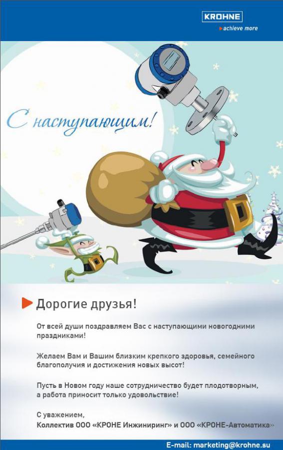 Дорогие друзья! От всего большого и дружного коллектива компании КРОНЕ, сердечно поздравляем Вас с Новым 2014 годом! Желаем вам, вашим коллегам и близким, крепкого здоровья, удачи и успехов! Выражаем искреннюю признательность за Вашу работу, - сотрудничать с Вами всегда приятно для нас. Желаем Вашему предприятию процветания и надеемся, что наше дальнейшее сотрудничество будет еще более плодотворным! C Наступающим Новым Годом и рождеством!