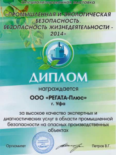 Компания «РЕГАТА-Плюс», занимающаяся экспертной деятельностью в области обеспечения промышленной безопасности, приняла участие в форуме «Комплексная безопасность-2014», который состоялся в Уфе 7-9 октября. По окончании форума компания удостоена диплома за высокое качество экспертных и диагностических услуг в области промышленной безопасности на опасных производственных объектах.