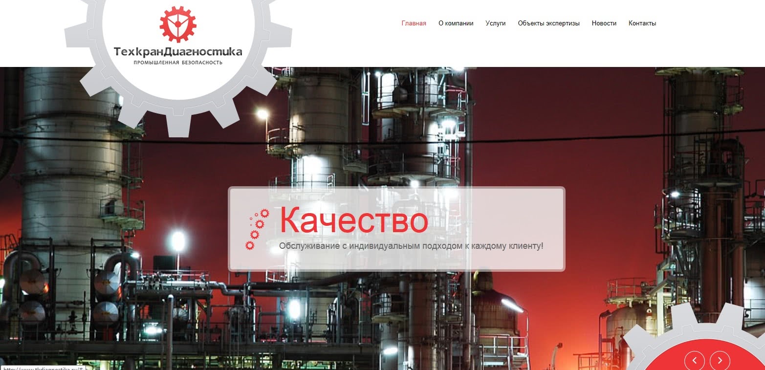 В условиях динамичного развития глобальных информационно-коммуникационных технологий корпоративные web-ресурсы становятся одним из основных инструментов информационного и маркетингового воздействия на потребителей. Обновление сайта компании «ТехкранДиагностика» является запланированным этапом ее развития и способствует эффективному взаимодействию с заказчиками. О компании Компания «ТехкранДиагностика» основана в 2004 году, занимается экспертной и проектно-изыскательской деятельностью в области обеспечения промышленной безопасности. В компании работают специалисты и эксперты высокой квалификации, имеющие многолетний опыт работы в области промышленной безопасности в химической, нефтехимической, нефтеперерабатывающей, газовой, металлургической, горнодобывающей промышленности и топливно-энергетическом комплексе. Система менеджмента качества «ТехкранДиагностика» сертифицирована по международному стандарту ISO 9001:2008. Услуги компании востребованы предприятиями различных отраслей промышленности, среди ее заказчиков – ОАО «Мосгаз», ОАО «МОЭК», ООО «Строительное управление № 5», ГУП МО «Мособлгаз» и др. Сайт: www.tkdiagnostika.ru