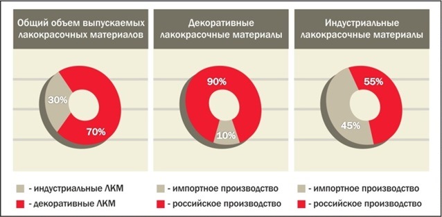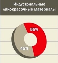 Чиновники считают санкции шансом для развития отечественной промышленности, а руководители некоторых компаний видят в них риск снижения качества при росте цен. Ситуация с импортом активно обсуждается и в лакокрасочной отрасли. На сентябрьском заседании Комиссии РСПП по химической промышленности и Совета Российского союза химиков приводилась статистика: в секторе декоративных лакокрасочных материалов импорт составляет всего 10% - и это в основном краски премиум - сегмента, так что импортозамещение в этом секторе не так актуально, а вот в индустриальных ЛКМ доля, выпускаемая российскими предприятиями составляет 55%, а 45% импортируется¹ (см. диаграмму). Как видно – шанс заменить иностранные материалы существует именно в этом сегменте.