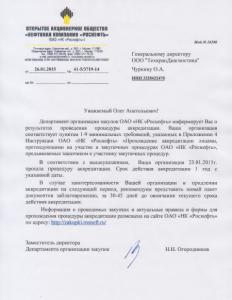 В официальном уведомлении НК «Роснефть» сообщается, что «ТехкранДиагностика» соответствует требованиям, предъявляемым к участникам закупочных процедур, и вошла в список потенциальных поставщиков НК «Роснефть».