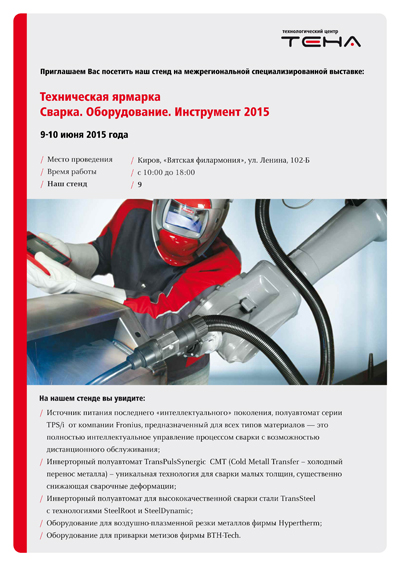 Технологический центр ТЕНА приглашает Вас посетить межрегиональную специализированную выставку «Техническая ярмарка. Сварка. Оборудование. Инструмент 2015», которая пройдет с 9 по 10 июня 2015 г. в Кирове.