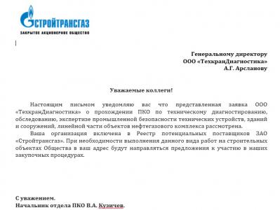Компания «ТехкранДиагностика», организация в области оценки технического состояния, диагностирования, экспертизы промышленной безопасности опасных производственных объектов, включена в реестр потенциальных поставщиков ЗАО «Стройтрансгаз».