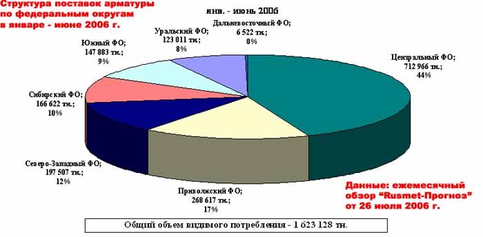 На диаграммах «Структура отгрузок (поставок) арматуры по федеральным округам в январе - июне 2006/2005 гг.» из июльского номера бюллетеня «Rusmet-Прогноз» на фоне сильно растущего потребления в Центральном (+26%), Приволжском (+46%) и Северо-Западном ФО (+64%) и остальных федеральных округов, где объём видимого потребления арматуры находится практически на уровне прошлого года, особенно ярко видно, что в 1 полугодии