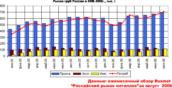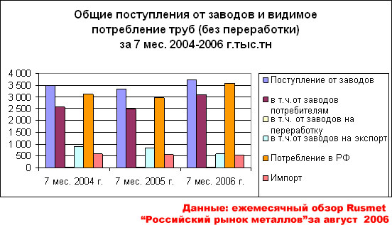 Согласно Rusmet-РРМ, за 7 мес. 2006г. по сравнению с аналогичным периодом 2005г. производство труб в России увеличилось на 17,4%, экспорт снизился на 9,9%, импорт увеличился на 18,6%, потребление труб увеличилось на 24,6%.