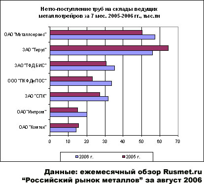 Видно, что только сеть Тирус улучшила свои показатели по сравнению с 2005 годом, с чем можно искренне поздравить Пелюгина Павла Евгеньевича. Остальные трейдеры свои показатели снизили. Здесь ничего удивительного нет – растет доля прямых поставок от производителей, плюс ко всему, паровозом роста являются, например, ТБД, если считать общий вклад в весь рынок, - они естественно, тоже поставляются потребителям напрямую. Лидерами ростапо абсолютной величине являются насосно-компрессорные трубы (+900%), чугунные трубы (+192%) и обсадные трубы (+46%). Сеть ТИРУС-МеТриС является одним из крупнейших в России универсальных трейдеров реализующих металлопродукцию. Товарный ряд Сети включает весь сортамент стальных горячекатаных и холоднодеформированных бесшовных труб, сварных труб, профильных труб, труб из пластика и отводов. Более подробно о рынке труб с детальными цифрами – в августовском номере Rusmet “Российский рынок металлов.” Форма заказа аналитики.