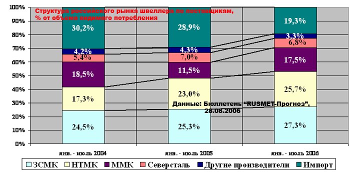 Ведущие отечественные производители швеллера, ЗСМК, НТМК и ММК, теснят с рынка импорт (19,3% в