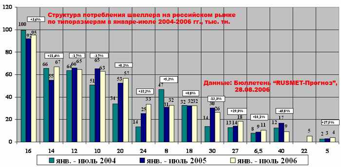 Из лидеров рынка наибольший рост показал швеллер 14 (+21,4%; +12 тыс. т), 20 (+8,2%; +4 тыс. т) и 16 (+3,6%; +3 тыс. т). Объем реализации остальных наиболее продаваемых размеров сократился. Почти вполовину упали продажи «сороковки» (-45,0%; -8 тыс. т), заметно меньше (-12,3%, -4 тыс. т) продается «тридцатки».