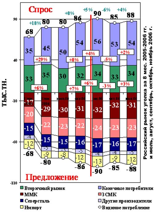На рынке уголка царит стагнация на высоком уровне потребления относительно прошлого года. По прогнозам Rusmet.ru, в сентябре объем рынка немного вырастет относительно августа до ~90 тыс. т/мес., а в октябре - ноябре нас ожидает небольшое снижение спроса до уровня 85 – 88 тыс.тн./мес.