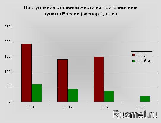 Столь существенное сокращение экспорта жести из России наблюдалось лишь в 2005 году (по сравнению с 2004 г.), когда в годичном исчислении спад составил порядка 30%. В 2006 году ситуация немного изменилась в сторону роста. Очередной виток спада, похоже, ждет нас в этом году.