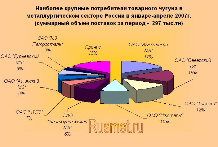 Лидирующим по потреблению товарного чугуна предприятием остался Выксунский металлургический завод, незначительно увеличивший закупку по сравнению с первой третью прошлого года (+2%). Значительные объемы поставок чугуна наблюдались также в адрес сокративших закупку Северского ТЗ и ОАО «Ижсталь» (-19% и 6% соответственно).