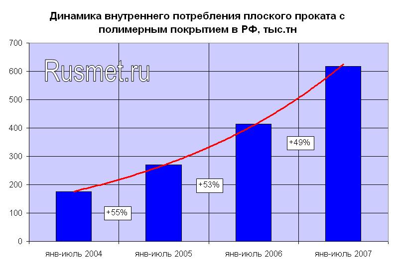 Еще более яркая картина потребления наблюдается на отечественном рынке плоского проката с полимерным покрытием. Динамику спроса на нем можно описать почти экспоненциальным трендом.