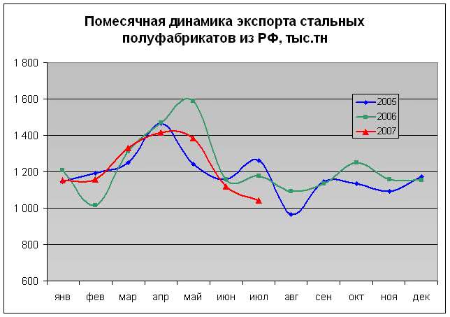 По итогам прошлого года объемы экспорта слябов, заготовки и прочих стальных полуфабрикатов российского производства составили 14,7 млн.т. Похоже, что этот самый высокий показатель за последние годы так и останется пиковой отметкой в разрезе четырех лет (стоит, правда, сказать, что и в 2004-2005 гг. объемы экспорта переваливали за отметку 14 млн.т). В текущем году отмечается пусть не очень сильный, но достаточно устойчивый спад экспортных поставок стали низких переделов за пределы страны.