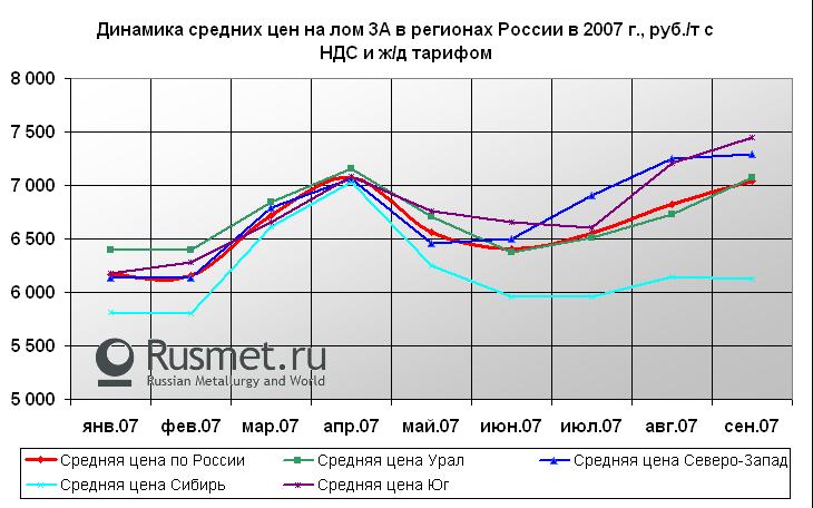 /© Rusmet.ru, Марк Сергеев/ Рост потребления лома черных металлов на внутреннем рынке (+9-12%) на фоне относительного стабильных объемов ломообразования (+1-2%) приводит к вполне адекватной реакции рынка: металлурги борются за поставки сырья на свои склады, в результате чего цены растут. После серьезного спада ценников, наблюдавшегося в мае-июне(отметим, правда, что спад этот произошел после небывалого подъема цен дорекордных величин), потребители внутреннего рынка планомерно повышают закупочные цены. Начиная с июля текущего года на рынке наблюдается положительный ценовой тренд. Средняя цена по России к началу осени «пробила» отметку в 7000 руб. (за тонну ЗА, с НДС и ж/д тарифом), и это с учетом весьма низкого уровня цен на лом в Сибири. Фактически же у многих потребителей ценники перешагнули за «семитысячную» отметку еще в августе.