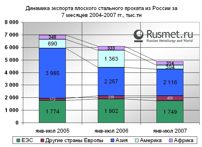 По итогам первых семи месяцев текущего года спад экспорта российского плоского проката составил 20% по сравнению с периодом январь-июль прошлого года. За период из страны было отгружено всего порядка 4,9 млн.т листовой стали. География экспорта также претерпела существенные изменения. Поставки в Европу по сравнению с прошлым годом практически не изменились, правда, это данные с учетом поставок в Украину. Снижение же отгрузки потребителям ЕС составило порядка 8% (наиболее значительно сократилась отгрузка в Италию (-26%,-0,2 млн. т), что отчасти было компенсировано увеличением экспорта в Польшу(+55%, +52 тыс.т)).