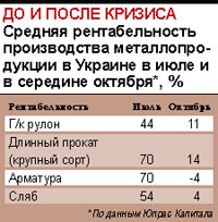 Как результат — резкое сокращение в сентябре объемов производства украинскими и зарубежными меткомпаниями. По данным Укрпромвнешэкспертизы, в июле средняя загрузка отечественных сталелитейных компаний составляла 94%, в конце сентября — 63%. По словам металлургов, к середине октября загрузка украинских метмощностей упала до 50-55%. При этом рентабельность производства снизилась практически до нуля. По данным ИК «Юпрас Капитал», себестоимость производства тонны заготовки или слябов в октябре на разных украинских метзаводах варьировалась в пределах $620-690. «Однако продать товар даже по цене $600 за тонну непросто», — говорит Александр Макаров.