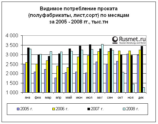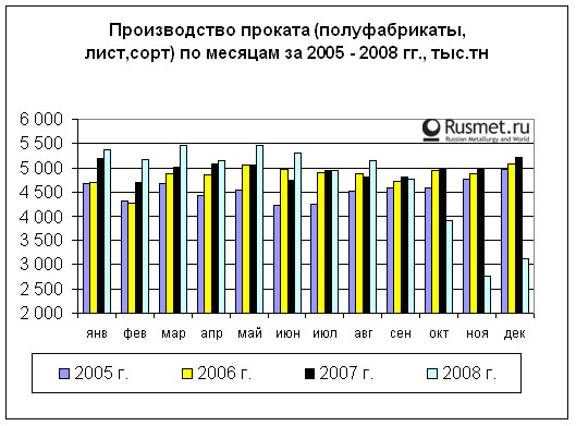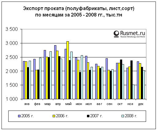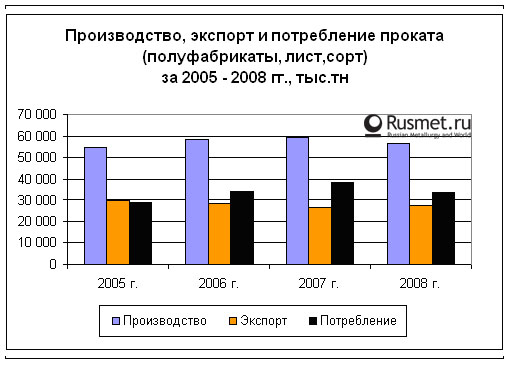 /Rusmet.ru, Балагушкин Сергей/ В истекшем году при снижении производства проката (полуфабрикаты, лист, сорт) на 5% по сравнению с успешным 2007 годом до 56,6 млн.тн, экспорт увеличился на 1% и достиг уровня 27,4 млн.тн. Доля экспорта от производства составила 48%. В то же время потребление уменьшилось на 14,4% (до 33,9 млн.тн).