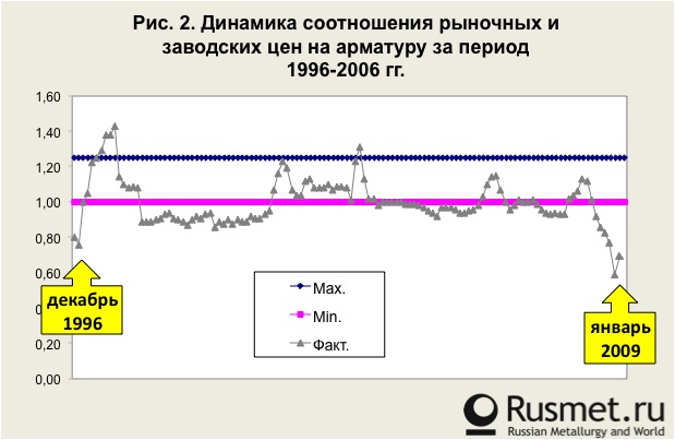 Попытаемся лучше выйти из логического тупика. Начнем танцевать от печки. Цены трейдеров должны быть выше цен производителей, что на отдельных этапах мониторинга фиксируется. Возьмем соотношение цен трейдеров и цен производителей К = Ц тр./Ц пр. и обговорим логические пределы: 1<K<1,25, обозначим терминологически данную зону как рыночную. Расположим соотношения цен производителей и трейдеров по позиции «Арматура» в данной системе координат (рис. 2).