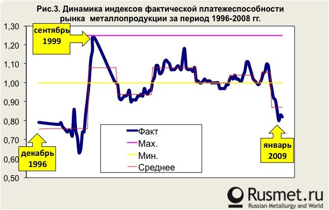 Вернемся к современному рынку металлопродукции. За все время мониторинга с 1996 года по усредненным показателям значения коэффициента К изменялись в пределах от 0,78 в условиях крайне низкой конъюнктуры до 1,07 в условиях хорошей конъюнктуры. По уже конкретным ценовым показателям значения коэффициента К изменялись в пределах 0,63< К <1,24, не переходя в зону спекулятивного рынка. т.о., значения данного коэффициента можно использовать как лакмусовую бумажку, характеризующую конъюнктурное состояние рынка и проводить не только ценовой мониторинг, но и мониторинг конъюнктурного состояния рынка.
