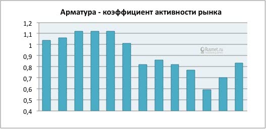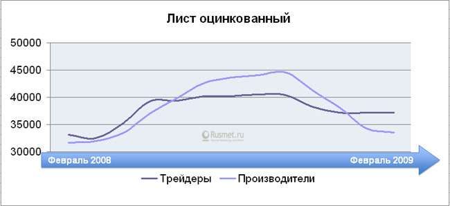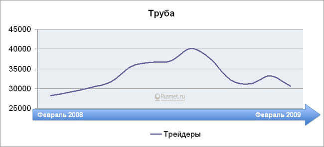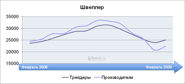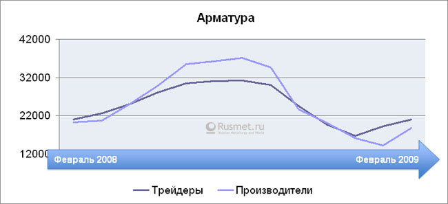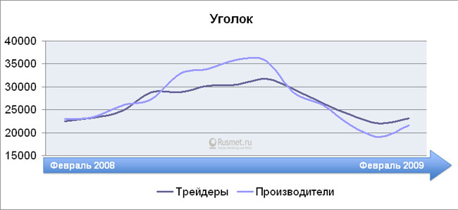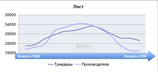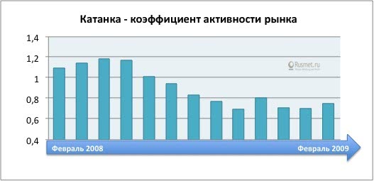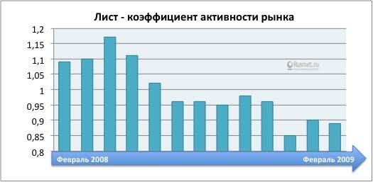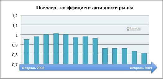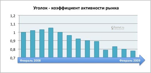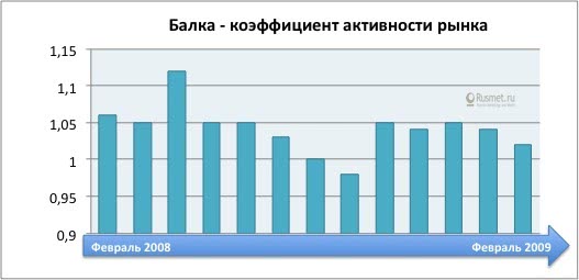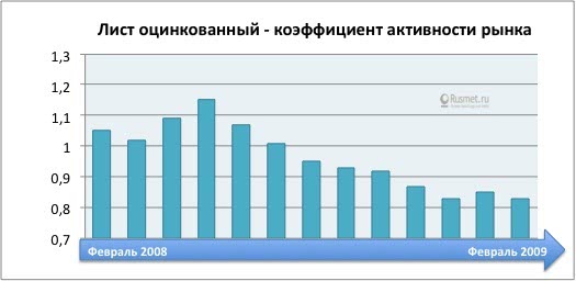 Проследим лучше за динамикой активности рынка металлопродукции за тот же период: от февраля до февраля 2008-2009 гг. Картина представляется совершенно иной. Показатель по вертикальной оси отражает конъюнктурное состояние рынка, его реальный обеспеченный живыми деньгами спрос. Если коэффициент близок к единице — конъюнктура умеренная, если ниже единицы, как было в предкризисные годы до августа