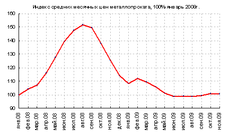 По данным SteelWeek на 27.11.2009 за месяц общий индекс мировых цен на стальную продукцию снизился на 3,8%. Плоский прокат подешевел на 4,1%, а длинномерный подешевел на 3,3%. На европейском рынке цены снизились на 5,5%. На азиатском рынке цены снизились на 1,5%. Цены на рынках Северной Америки снизились на 6,7%.